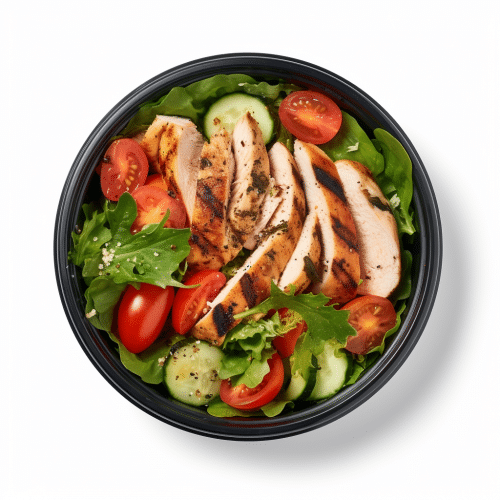 Poulet, salade, tomate, cheddar, sauce fromagère.